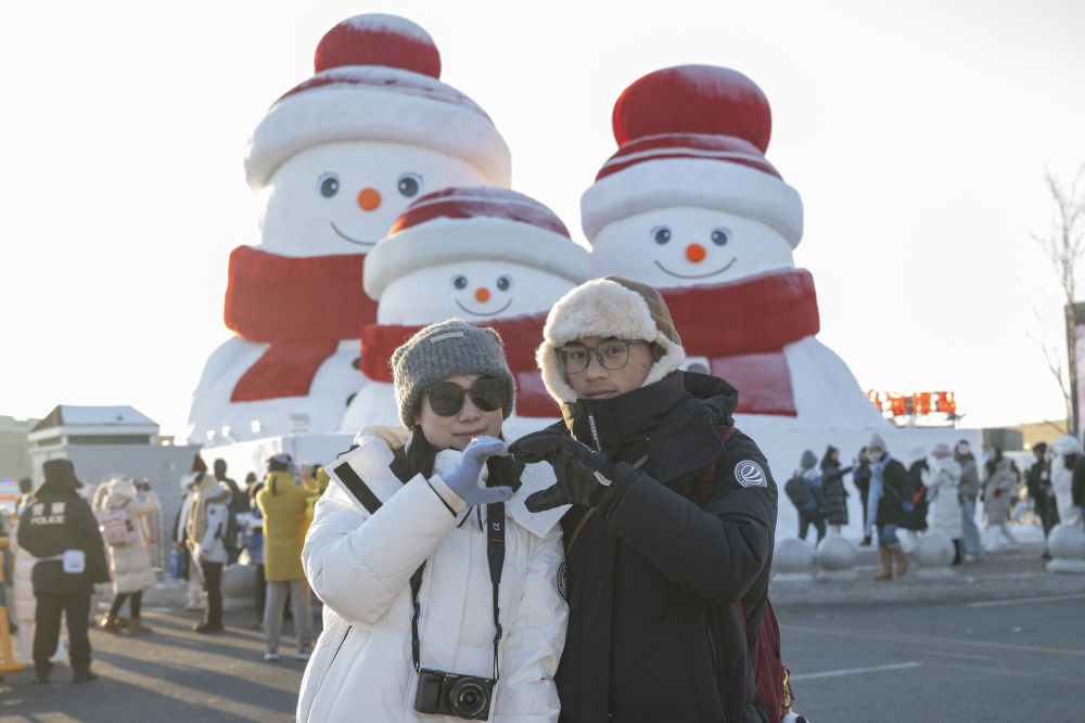 1月3日,在哈爾濱新區(qū)“爾濱之心歡樂島”,游客與雪人“東東北北”合影。