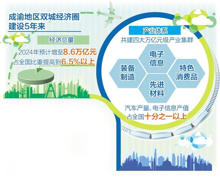 一是具有全國(guó)影響力的重要經(jīng)濟(jì)中心建設(shè)實(shí)現(xiàn)新躍升。經(jīng)濟(jì)總量上,雙城經(jīng)濟(jì)圈地區(qū)生產(chǎn)總值5年邁上了兩個(gè)萬億元級(jí)臺(tái)階,2024年預(yù)計(jì)增至8.6萬億元,占全國(guó)的比重由6.3%提高到6.5%以上;產(chǎn)業(yè)體系上,兩地共建電子信息、裝備制造、先進(jìn)材料、特色消費(fèi)品四大萬億元級(jí)的產(chǎn)業(yè)集群,汽車產(chǎn)量、電子信息產(chǎn)值占全國(guó)十分之一以上。