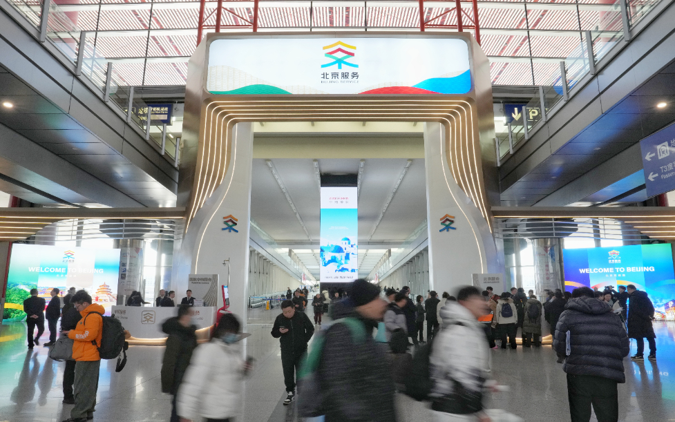 圖為2025年1月8日,在北京首都國際機場T3航站樓拍攝的“北京服務”機場服務點。從1月1日起,北京在首都國際機場和大興國際機場的國際到達出口設立“北京服務”機場服務點,為來華、來京外籍人士提供金融、通訊、交通、文旅等四個主題的20余項高頻服務,便利八方來客暢游中國。新華社發(fā) (鞠煥宗攝)