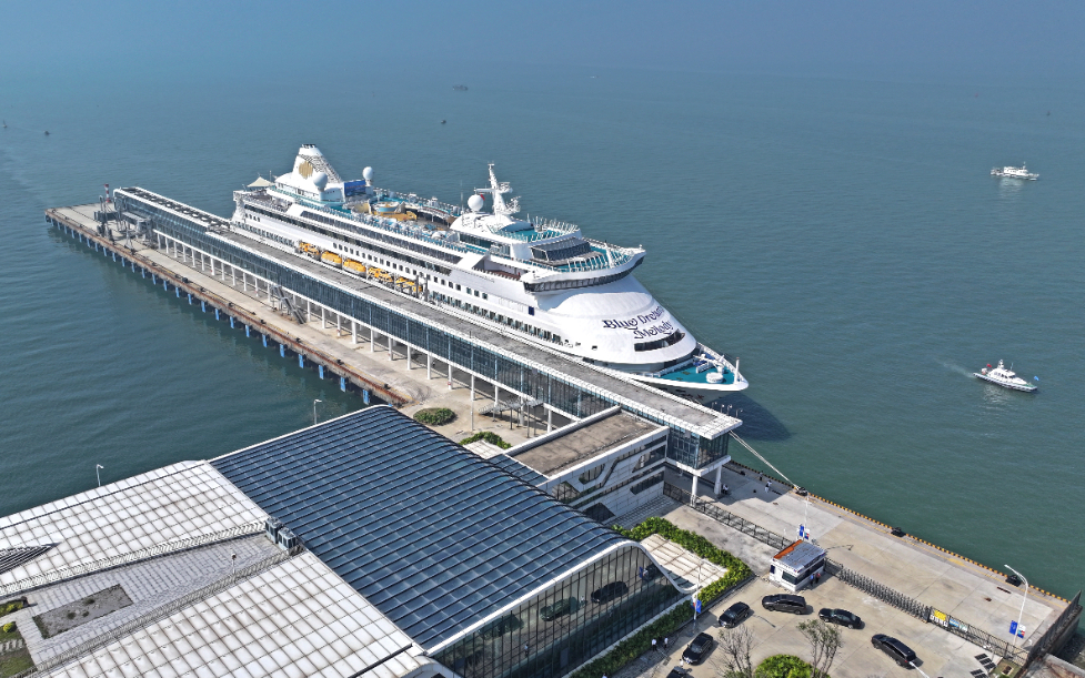 圖為2024年11月15日在北部灣國際郵輪母港拍攝的即將執(zhí)行首航任務的“藍夢之歌”號郵輪。新華社發(fā)(無人機照片,周華攝)。