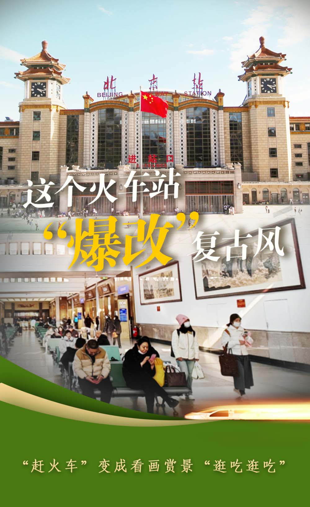 北京站之變折射出中國鐵路之變。文化味濃了,封閉的門拆了,洗手的水熱了,廁所的味沒了。今年春運(yùn),全國鐵路發(fā)送旅客有望突破5.1億人次。從“走得了”到“走得好”,中國鐵路正在高質(zhì)量發(fā)展的道路上快步前行。(海報:胡傲霜)