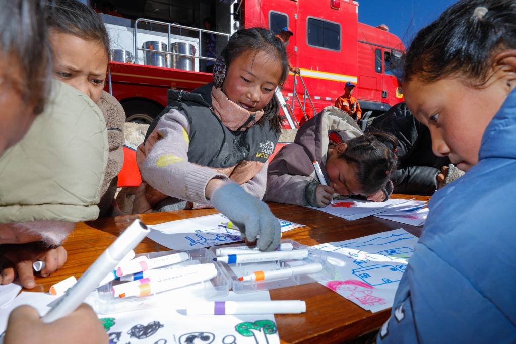 1月11日,在定日縣曲洛鄉(xiāng)措昂村臨時(shí)安置帳篷間的空地上,孩子們?cè)诋?huà)畫(huà)。(新華社記者 沈伯韓 攝)
