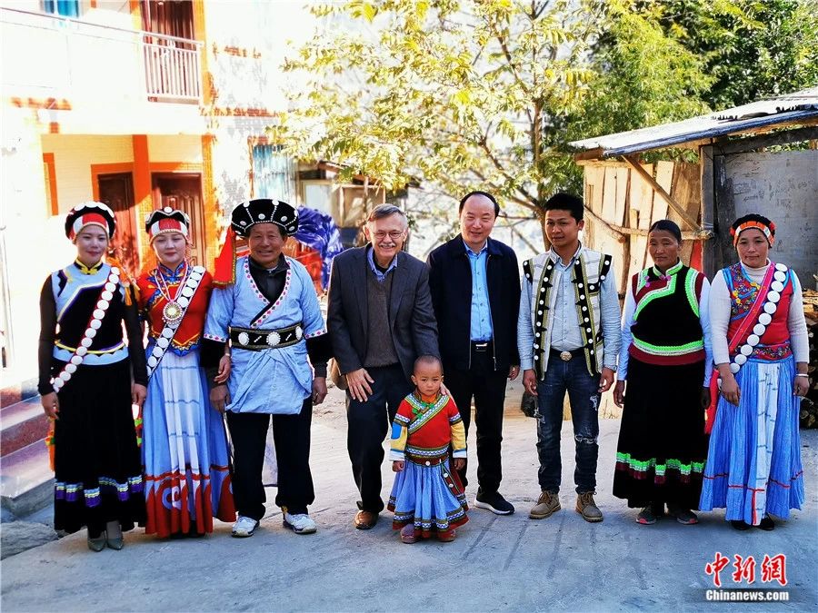 2019年第二次環(huán)游中國(guó)期間,潘維廉(左四)在云南與傈僳族居民在一起。受訪者供圖