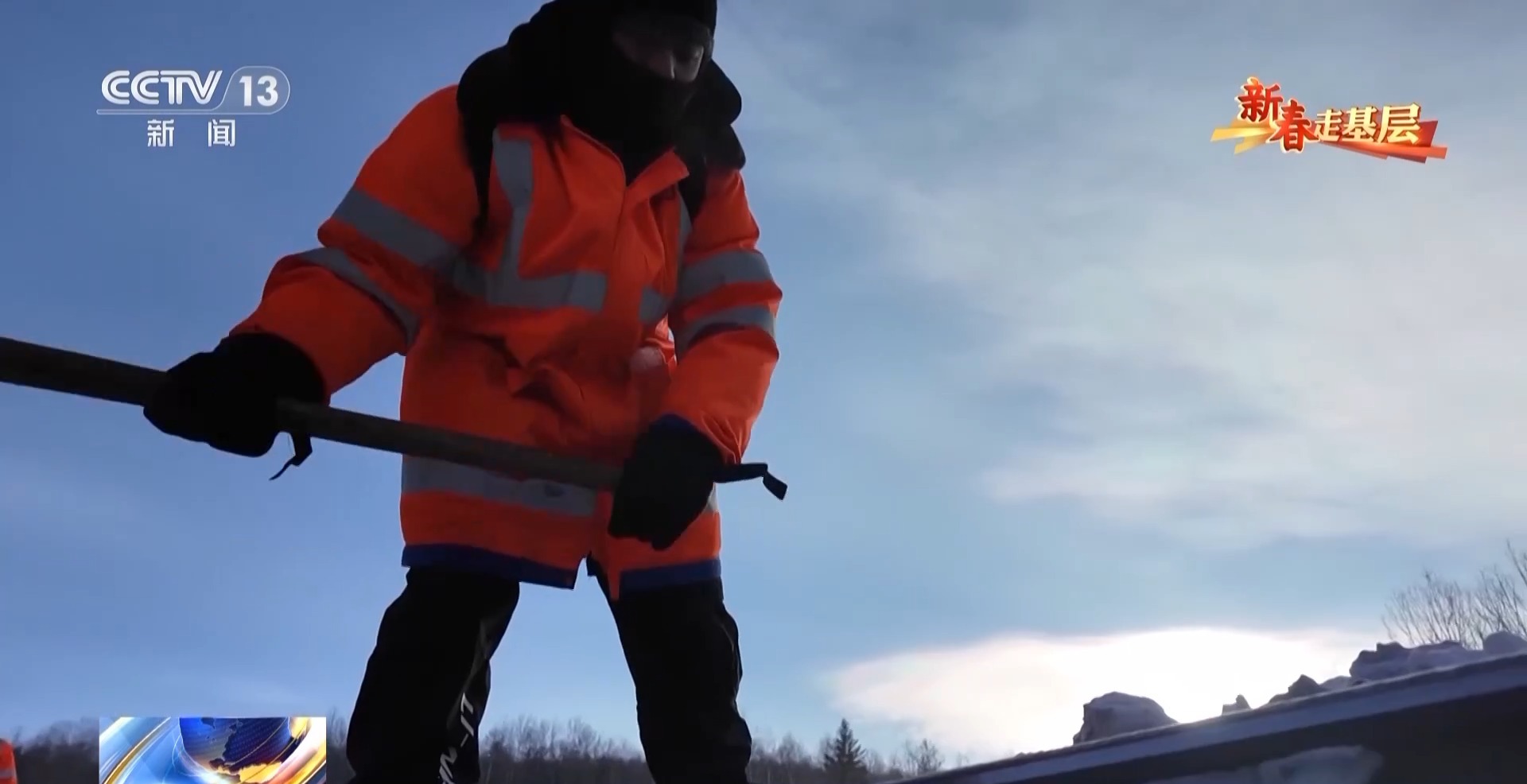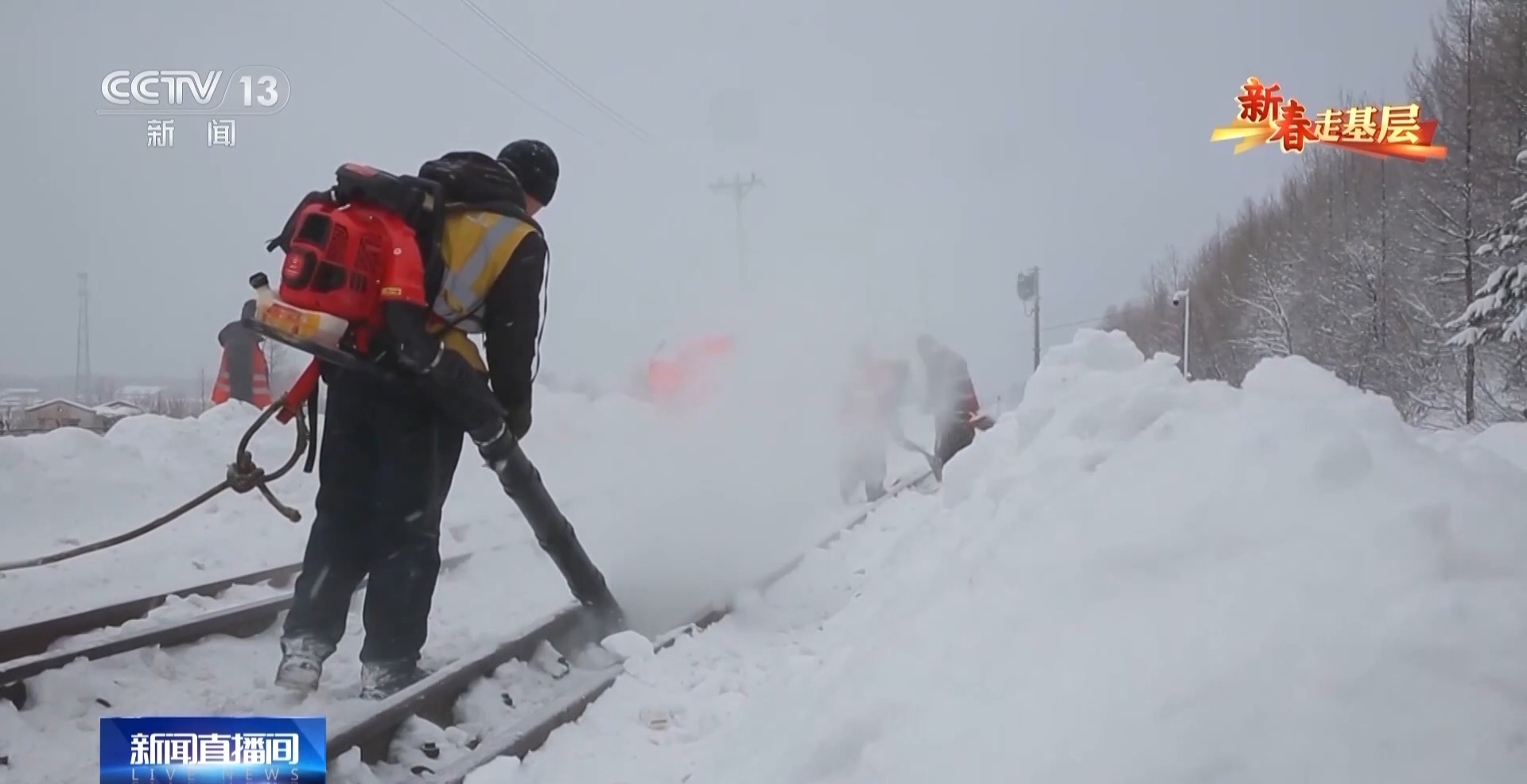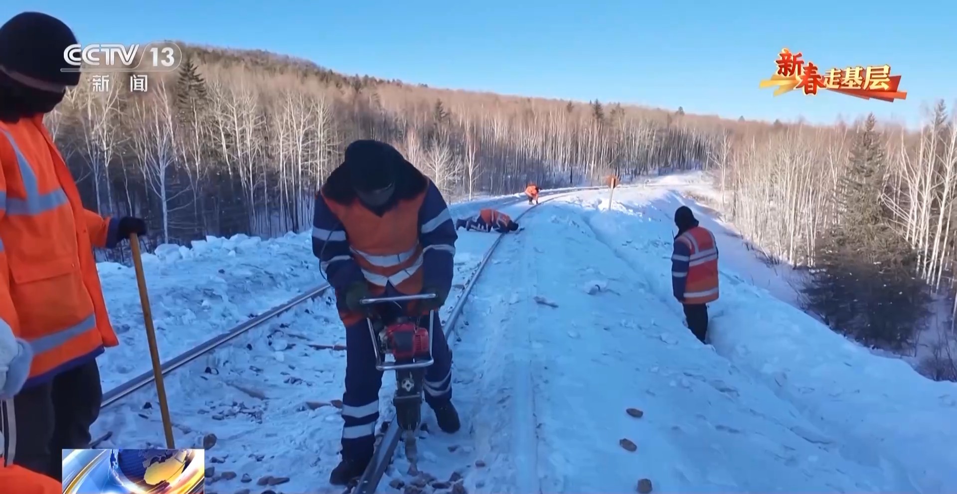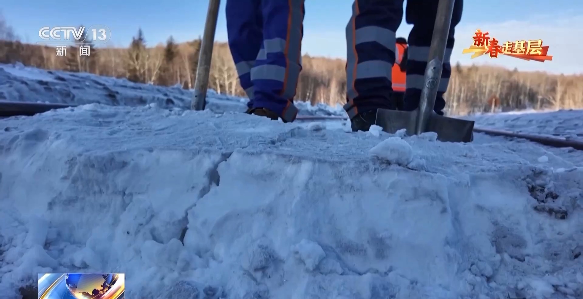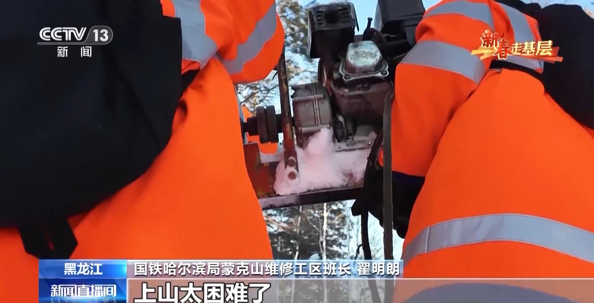 國(guó)鐵哈爾濱局蒙克山維修工區(qū)班長(zhǎng) 翟明朗:要下山還行,上山太困難了,山里有溝的地方我們看不到,雪都是平的,而有的時(shí)候一踩禿嚕就掉雪溝里了。