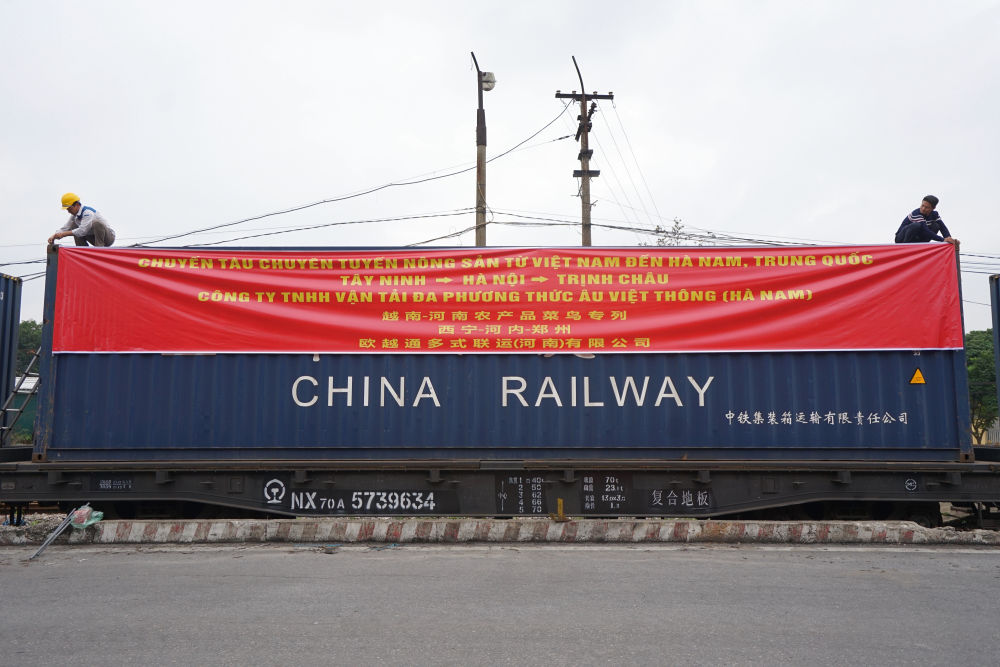 2024年1月15日,載有1000噸木薯淀粉的中越班列列車從越南河內啟程,駛向中國鄭州。新華社記者 胡佳麗 攝