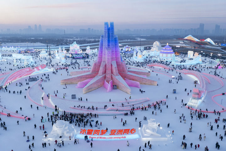 2025年1月5日,在哈爾濱冰雪大世界園區(qū),游客在主塔“亞洲同心”附近游玩(無人機照片)。新華社記者 謝劍飛 攝