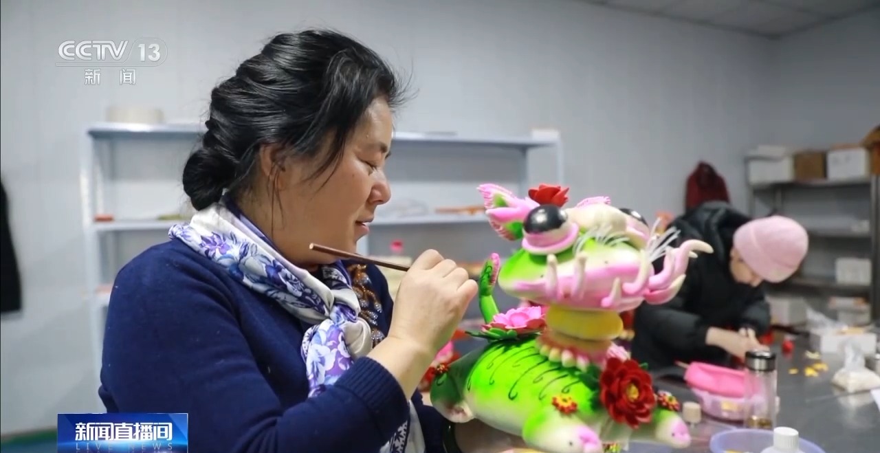 花饃藝人 朱雪冰:今年是蛇年,我們做了“蛇年大吉”這款花饃,這個蛇是用卡通的塑形和傳統(tǒng)的文化相結(jié)合,它不僅受到老年人喜歡,特別是青年人更喜歡。