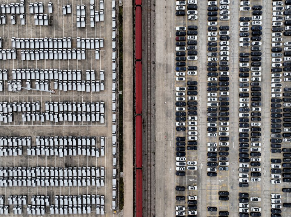 這是在中鐵聯(lián)集武漢中心站拍攝的整裝待發(fā)的汽車(2024年11月16日攝,無人機(jī)照片)。新華社記者 邢廣利 攝