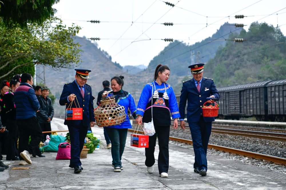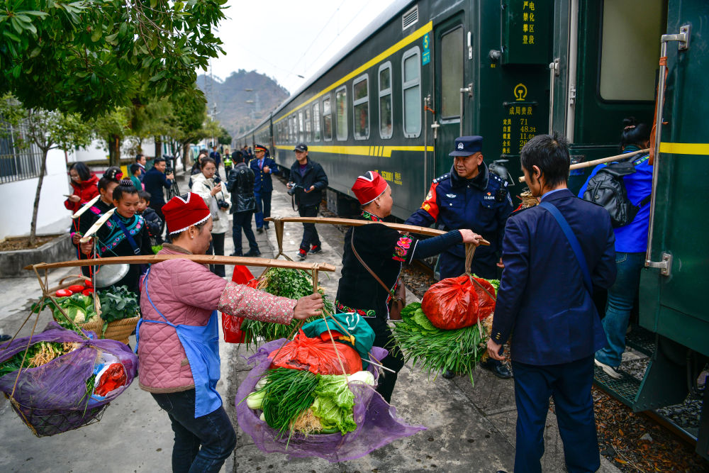 1月18日,在滬昆鐵路六個雞火車站,村民準備登上5640次列車售賣蔬菜和年貨。新華社記者 楊文斌 攝