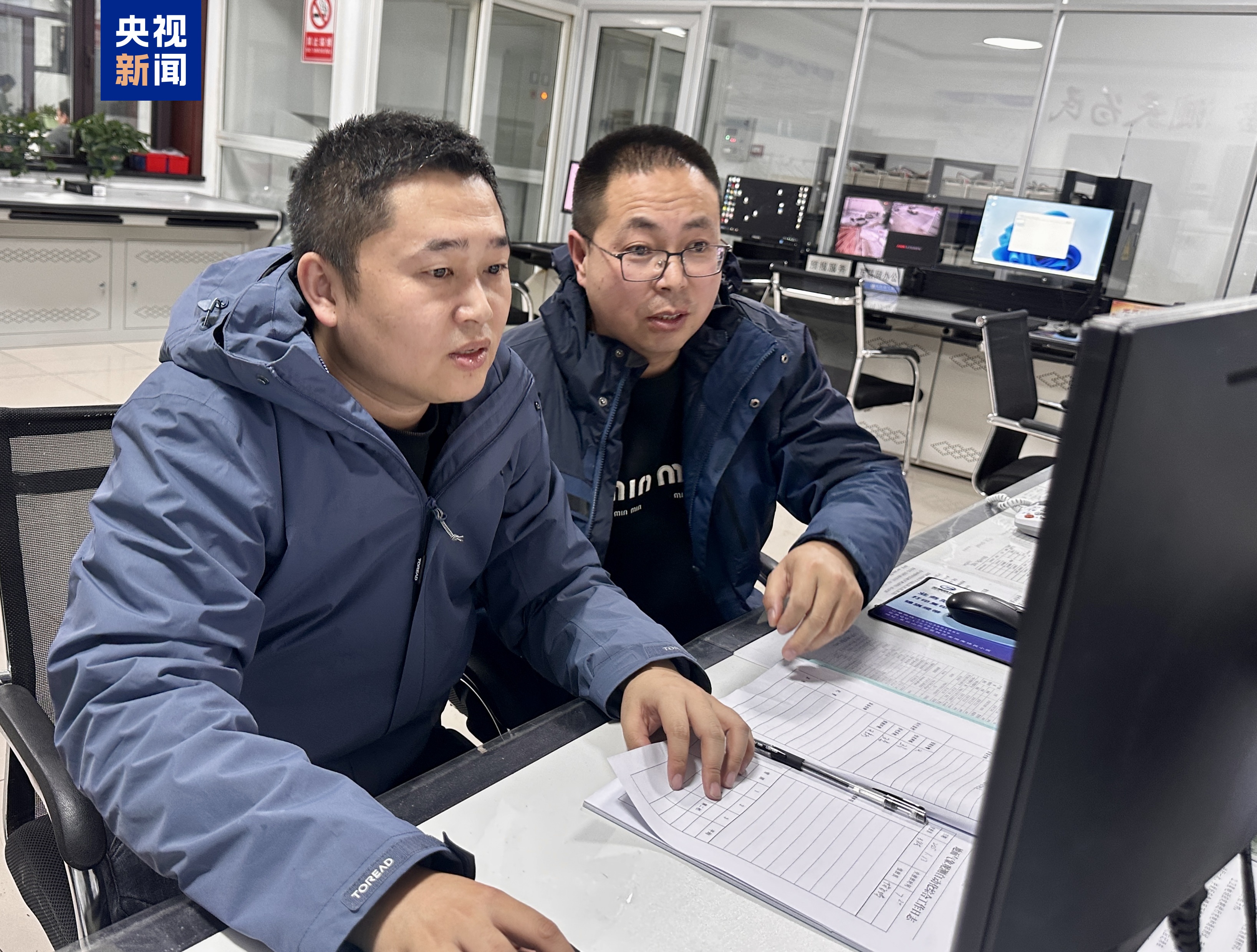 △楊飛鴻(左)與王俊杰(右)查看春運(yùn)氣象數(shù)據(jù)