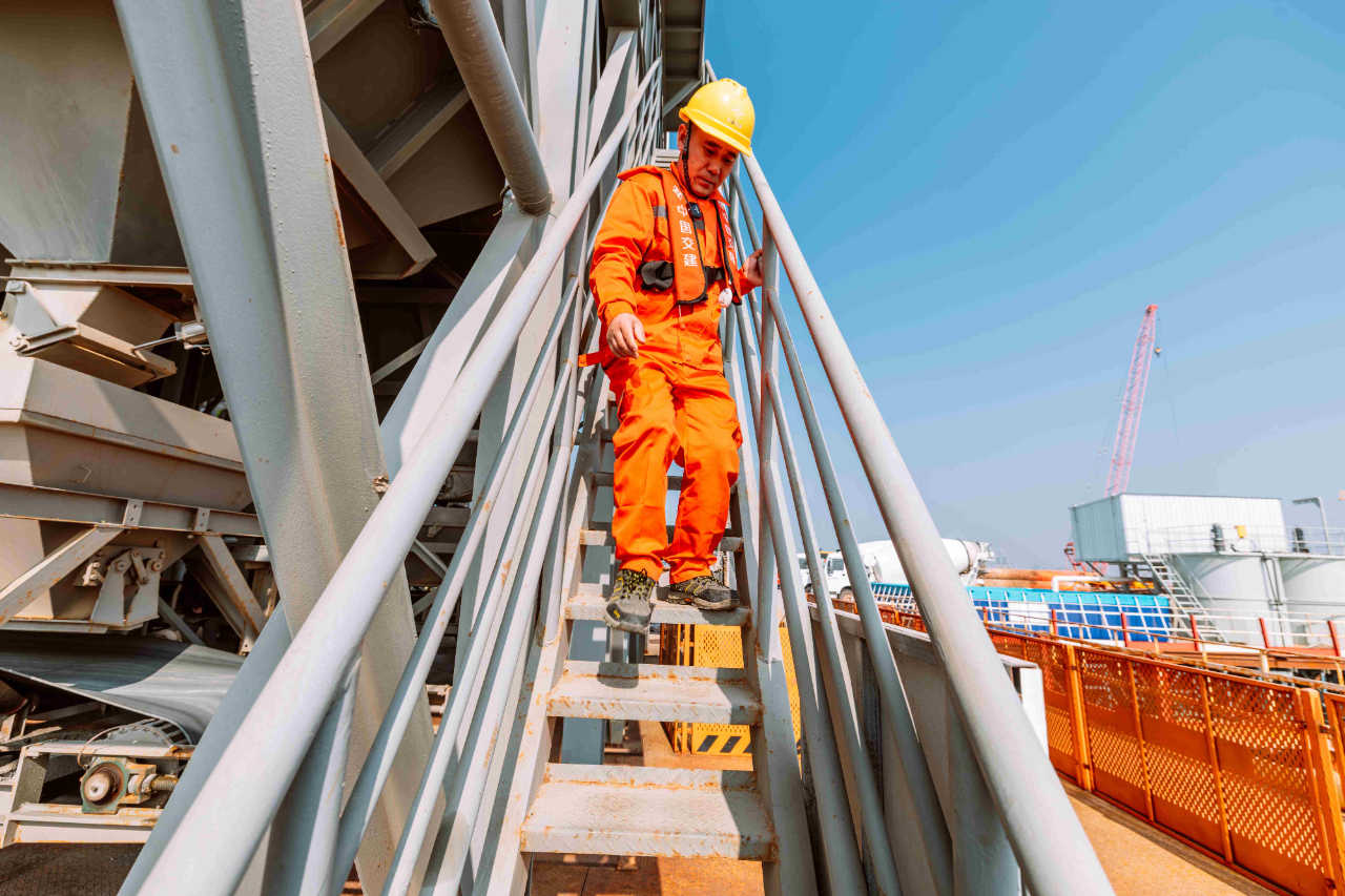 1月17日,夕陽下的廈門劉五店港區(qū),北風(fēng)勁吹。在距離中交一公局集團(tuán)廈金大橋(廈門段)項(xiàng)目海上平臺(tái)混凝土操作員梁芝敬站立位置不到30米的洋面上,一艘船身印有“帆順168”字樣的補(bǔ)料船,裝載著4000多噸砂石緩緩抵近。船頭前方延伸出一條25米長的傳送皮帶,將船上的砂料源源不斷地送抵老梁眼前的鋼制固料斗內(nèi)。當(dāng)天他們要趁著海水退潮帶來的作業(yè)窗口,為站里補(bǔ)上700噸機(jī)制砂和900噸粒徑10到20毫米的小石子,以確?;炷琳旧a(chǎn)不停機(jī)。