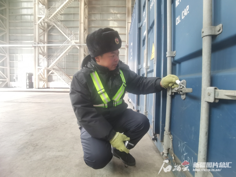 1月20日,譚磊正在阿拉山口站集裝箱換裝庫(kù)檢查集裝箱上的封印。石榴云/新疆日?qǐng)?bào)記者 白素君 攝