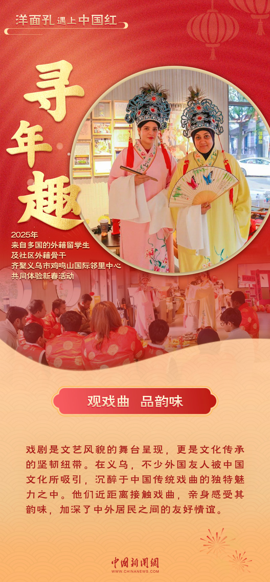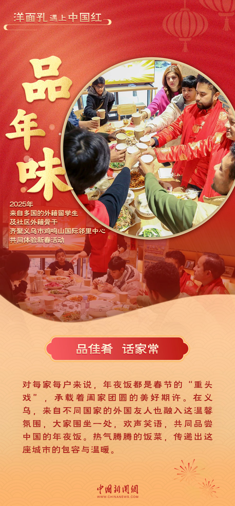 當(dāng)“洋面孔”遇上“中國(guó)紅”,一場(chǎng)跨越文化的交融在義烏上演。紅火的對(duì)聯(lián)、熱鬧的戲劇表演、香甜的年夜飯……外國(guó)友人們沉浸在中國(guó)年的喜慶氛圍中,感受著這份獨(dú)特的溫暖與歡樂(lè)。義烏的年味,不僅溫暖了“世界老鄉(xiāng)”的心,也讓全球各個(gè)地方看到了中國(guó)年的魅力與溫度。