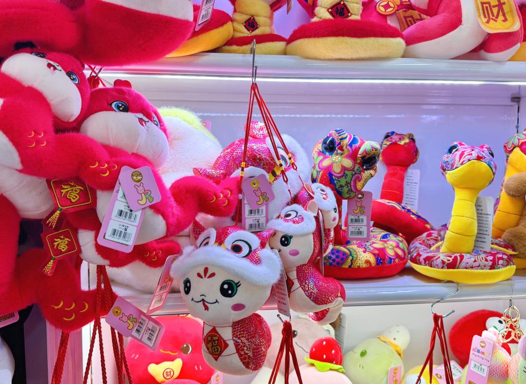 農(nóng)歷乙巳蛇年將至,結合生肖主題,陸慶榮與團隊早在去年七、八月就敲定了三十多個品種的款式設計,而十一月、十二月便是出貨銷售的高峰期,每天能賣出約兩萬只毛絨玩具。其中,“福寶蛇”和布藝蛇玩具是“人氣王”。