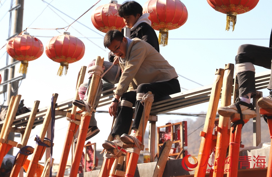 年輕人加入社火高蹺排練。人民網(wǎng)記者 甘海瓊攝