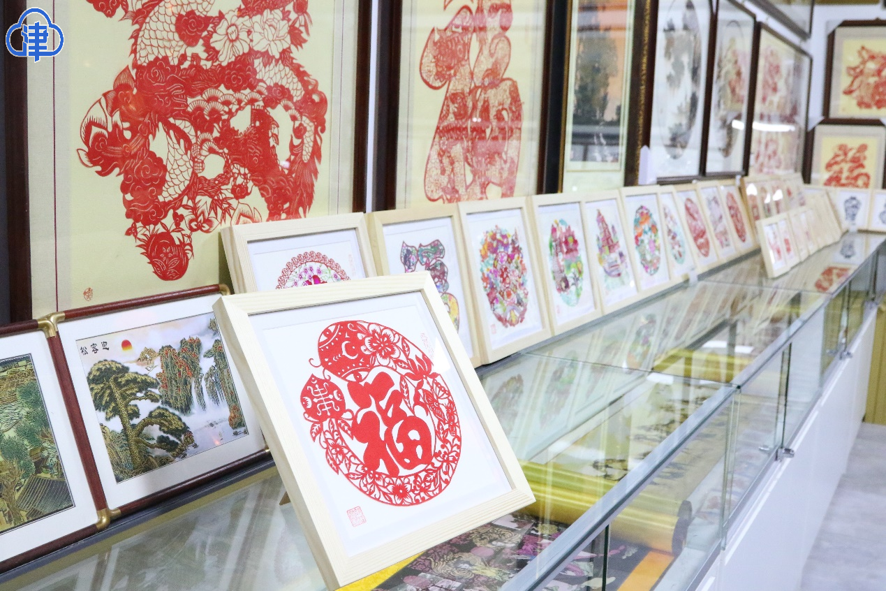 在戲樓對(duì)面,楊柳青剪紙世家第四代傳人,郝桂芬的剪紙鋪吸引了眾多游客的駐足。郝桂芬既是店鋪的“當(dāng)家人”,也是非遺剪紙項(xiàng)目的代表性傳承人。楊柳青剪紙的技法,既需要用北方剪刀剪出輪廓,又需要用南方刻刀雕飾細(xì)節(jié)。郝桂芬的獨(dú)門絕技——染色剪紙,是先用白紙剪出樣式,再用楊柳青年畫的技法上色。她的剪紙作品包括花鳥魚蟲、神話故事、喜慶吉祥圖案等,深受游客喜愛(ài)。在這里,游客們不僅可以購(gòu)買到精美的剪紙作品,還能在學(xué)習(xí)體驗(yàn)剪紙技法,感受指尖上的古老藝術(shù)。