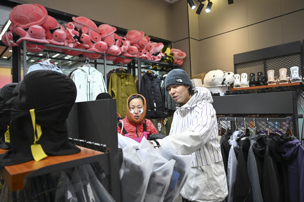 1月24日,游客在將軍山國際滑雪度假區(qū)的一家雪具店選購商品。