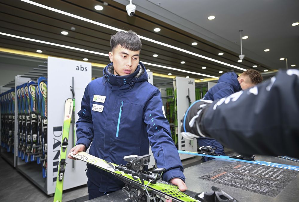 將軍山國際滑雪度假區(qū)員工斯拉吉丁·熱依木為“雪友”整理滑雪板(1月24日攝)。他畢業(yè)后在這里工作已有四年。