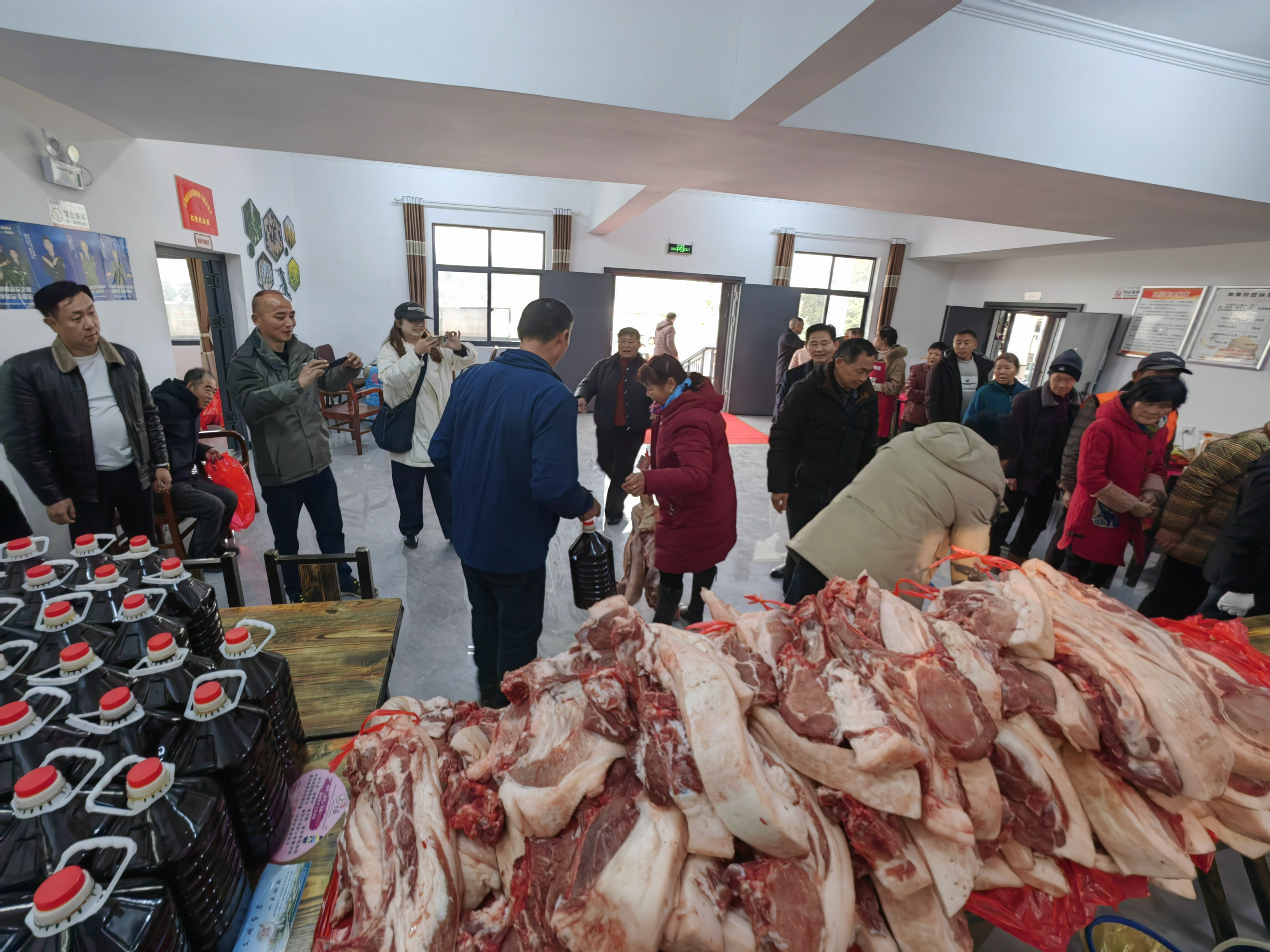 大廳里的長條桌上,一刀刀剁好的新鮮豬肉堆成小山,一袋袋自己種的生態(tài)米裝成包,一提提噴香的菜籽油擺放整齊,村民們早早排成長隊,開心地簽字領(lǐng)錢領(lǐng)米領(lǐng)肉?!罢媸菦]想到我能分到這么多紅利,我每周開車回來打掃衛(wèi)生,順便將社區(qū)朋友們訂的土雞和雞蛋帶回溫泉城區(qū)。”村民涂冬仁說。