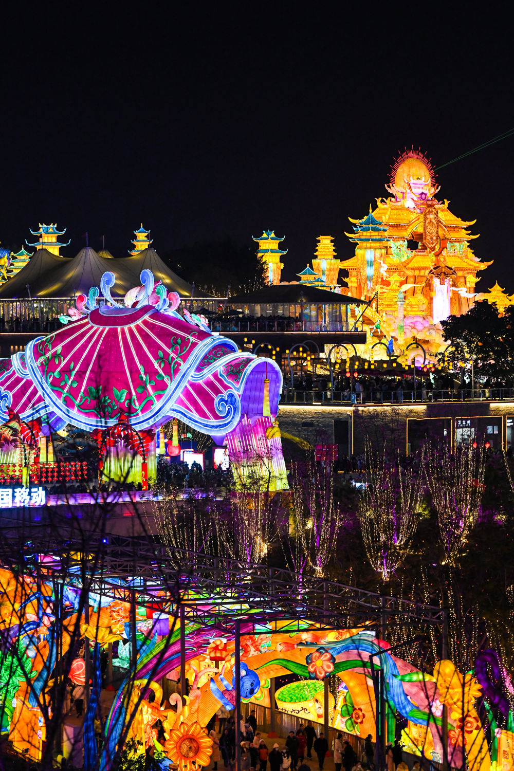 邱玥設(shè)計的燈組《一路繁花》位于第31屆自貢國際恐龍燈會西大門入口(1月27日攝)。