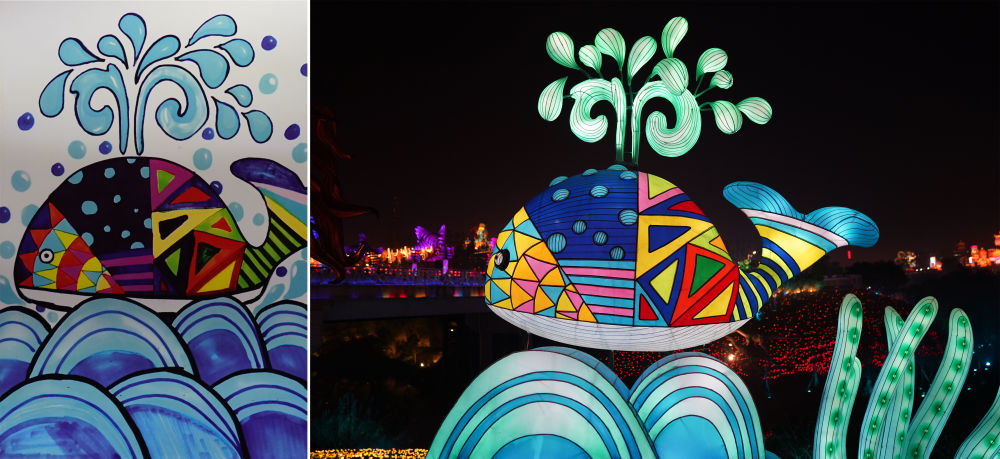 拼版照片:左圖為一名小朋友的繪畫作品《噴水的鯨魚》,右圖為彩燈工匠制作出的彩燈版《噴水的鯨魚》(1月14日攝)。