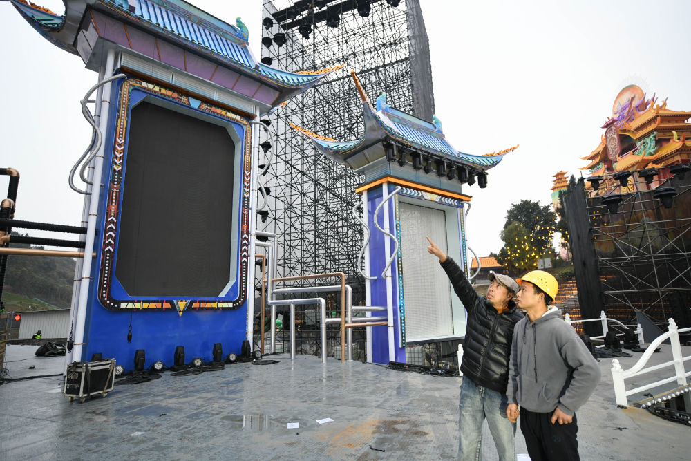 在第31屆自貢國際恐龍燈會主舞臺現(xiàn)場,萬松濤(左)與工作人員商討細節(jié),確保最終的呈現(xiàn)效果(1月14日攝)。