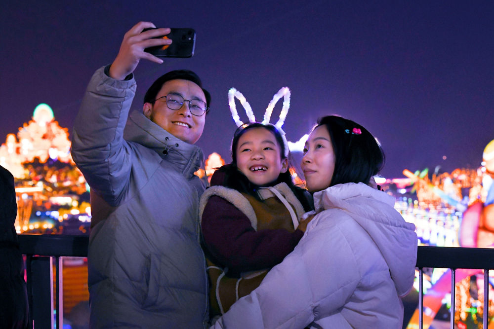 一家三代在第31屆自貢國際恐龍燈會試展上觀燈留影(1月14日攝)。