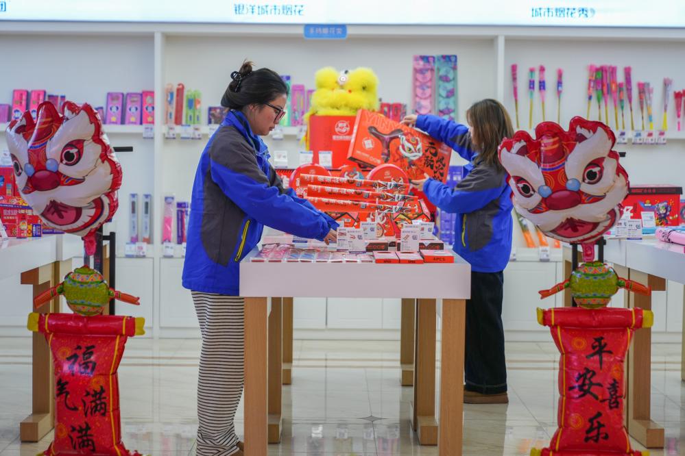 大瑤鎮(zhèn)一家花炮企業(yè)的員工在整理帶有春節(jié)元素的新產(chǎn)品。新華社記者 陳澤國 攝
