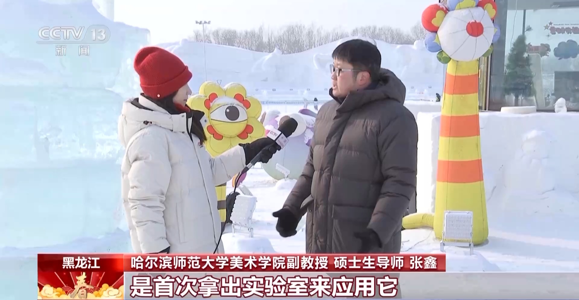 東北林業(yè)大學材料科學與工程學院教授、博士生導師 陳文帥:我們加入一些環(huán)境友好型的、植物級的分子,幫助這些色素在冰中非常好地分散,才達到目前我們這種效果。整個過程體系是綠色的、可持續(xù)的,這是我們一個最核心的理念,我們開發(fā)的這些試劑是環(huán)境友好的,當春暖花開的時候冰融化掉,它會變成營養(yǎng)物質(zhì)沉積到土壤里,滋生花草的生長。