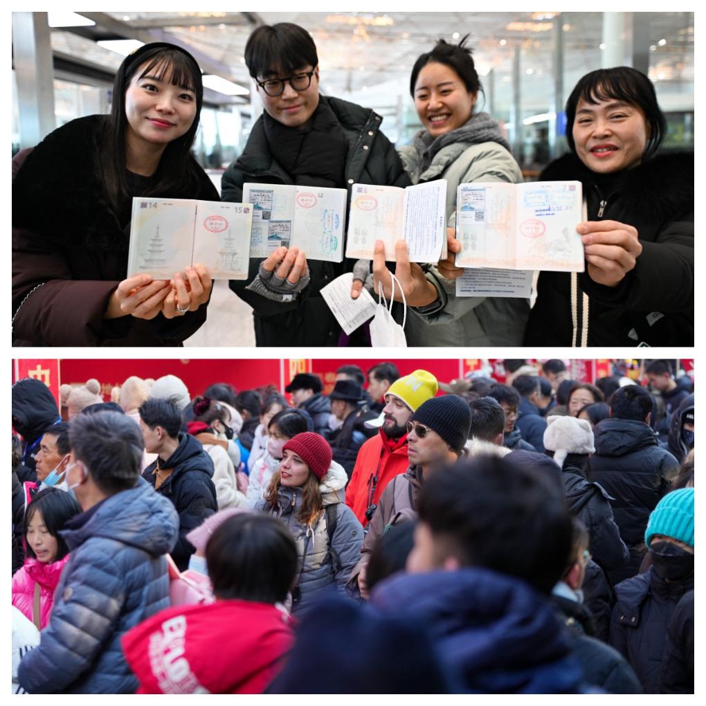 拼圖:(上圖)1月28日,在首都國際機(jī)場,四名韓國游客利用免簽政策來中國旅游,他們向記者展示著護(hù)照上的入境章。(下圖)1月29日,兩位來自西班牙的游客在北京地壇廟會(huì)游覽。
