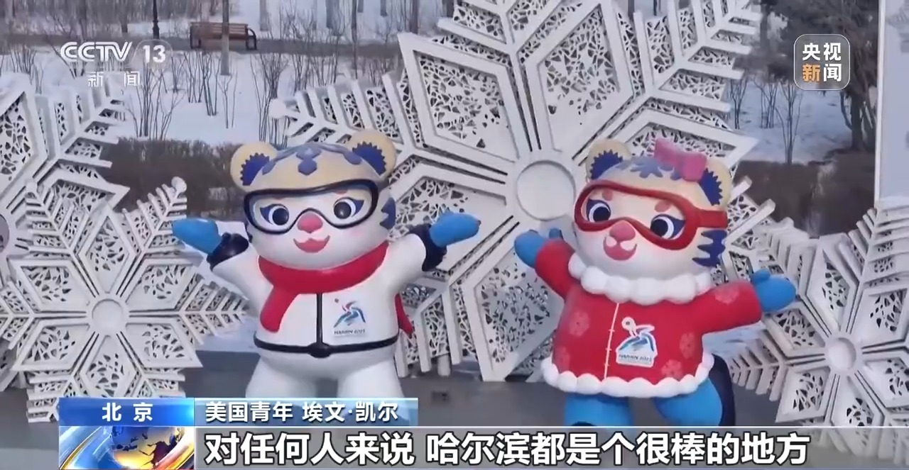 美國青年 埃文·凱爾:對任何人來說,哈爾濱都是個很棒的地方,這里盛行冬季運動。我特別喜歡吉祥物——妮妮和濱濱,老虎造型太可愛了。大家對我非常友好,我度過了一段美好時光。人們一定會非常享受今年的亞冬會。
