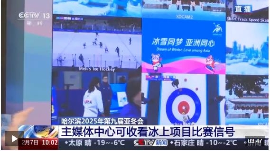 通過現(xiàn)場的大屏可以看到正在進行的比賽,大屏在賽時可提供所有冰上場館的9路信號,來自不同國家和地區(qū)的媒體記者可以根據(jù)自己的需求來選擇不同比賽場次信號來關注。