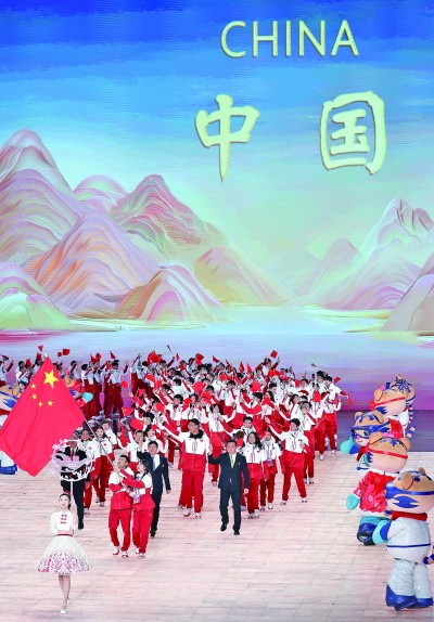 當中國代表團入場時,體育健兒揮手致意,現(xiàn)場觀眾起立鼓掌。在本屆亞冬會上,中國代表團將參加全部項目的比賽,并朝著“取得我國亞冬會參賽史上最好成績”的目標全力進發(fā)。