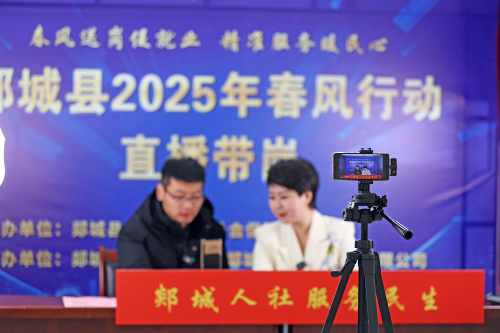 2月8日,工作人員在山東省臨沂市郯城縣“春風(fēng)行動(dòng)”專(zhuān)場(chǎng)招聘會(huì)現(xiàn)場(chǎng)進(jìn)行直播帶崗。新華社發(fā)(張春雷攝)