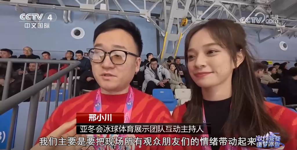 亞冬會冰球體育展示團(tuán)隊(duì)互動主持人邢小川介紹,他們主要是帶動所有觀眾朋友的情緒,給大家營造濃郁的現(xiàn)場氛圍,可以通過大屏幕互動,給大家?guī)砀玫挠^賽體驗(yàn)。