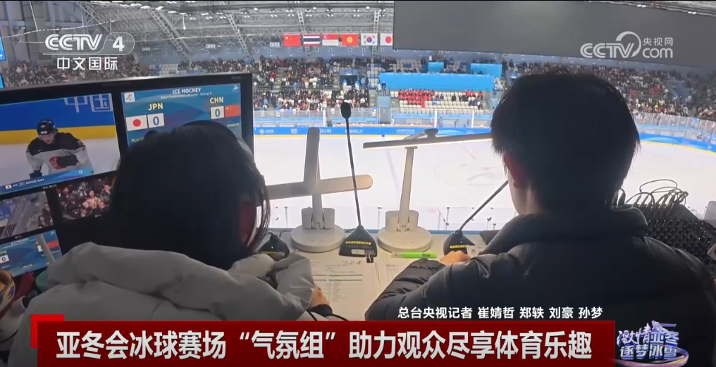 央視網(wǎng)消息:冰球比賽對抗激烈,運(yùn)動節(jié)奏快、場面精彩。第九屆亞冬會冰球項(xiàng)目賽場之一的哈爾濱冰球館,有這樣一個體育展示團(tuán)隊(duì),他們被稱為“氣氛組”,通過音樂、燈光、大屏幕、觀眾互動等多手段,讓觀眾一起享受比賽。