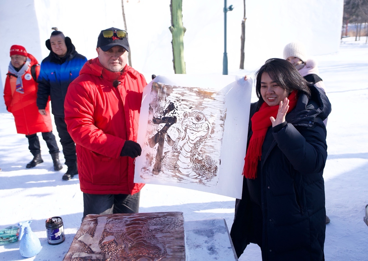 泰國駐華大使館二等秘書王安安在黑龍江省藝術(shù)研究院冰版畫研究院副院長盛琰的指導(dǎo)下,制作出冰版畫《畫蛇添福》,用蛇的形狀和漢字的偏旁部首組合雕刻出漢字“?!辈⑼赜〕鰜?,寄托對中國農(nóng)歷蛇年的祝福。