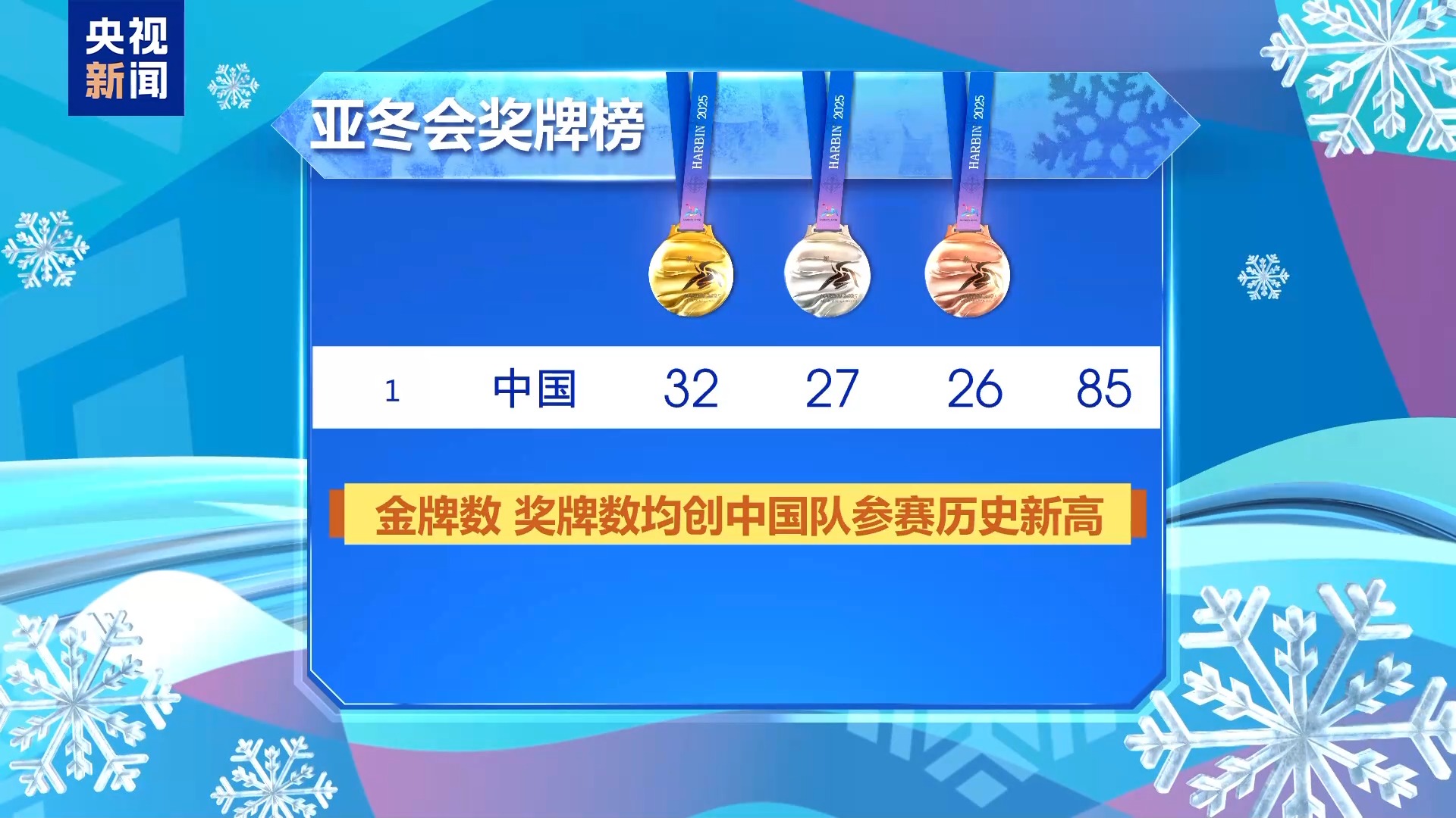 本屆亞冬會中國體育代表團參加了全部6個大項11個分項64個小項的比賽,以32金27銀26銅共85枚獎牌,位居金牌榜、獎牌榜首位,金牌數(shù)、獎牌數(shù)均創(chuàng)中國隊參賽歷史新高。