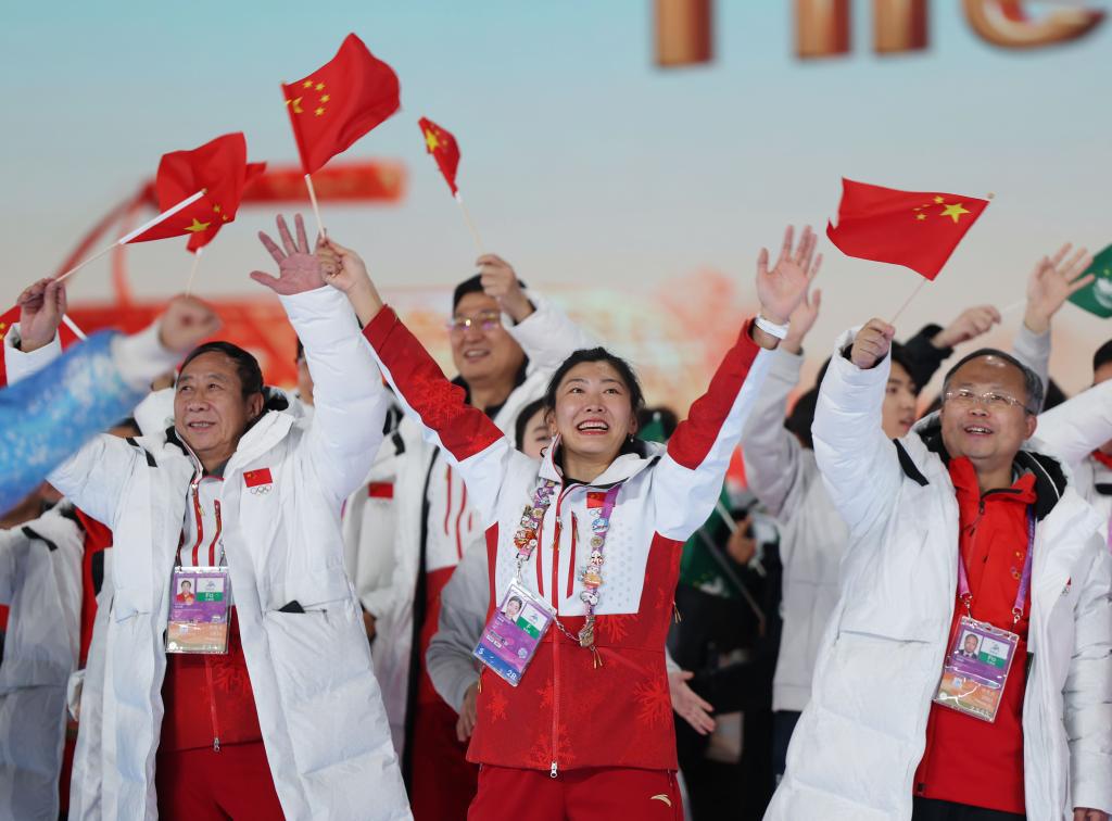 2月14日,中國體育代表團(tuán)旗手徐夢桃(中)在亞冬會(huì)閉幕式上。新華社記者 張濤 攝
