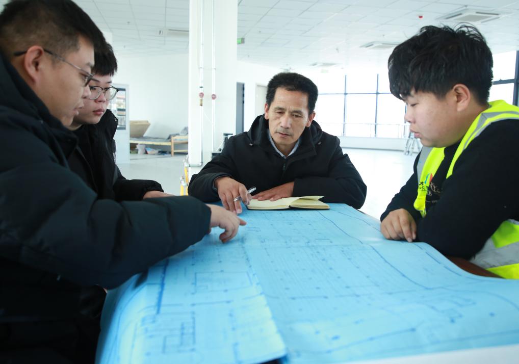 在項目部內(nèi),周培(右二)和工作人員對工程操作注意事項進(jìn)行研討。(受訪者供圖)