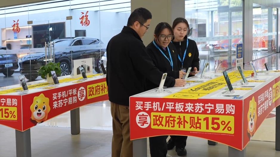 消費(fèi)者在蘇寧易購廣西三祺廣場(chǎng)店選購電子產(chǎn)品。(視頻截圖)