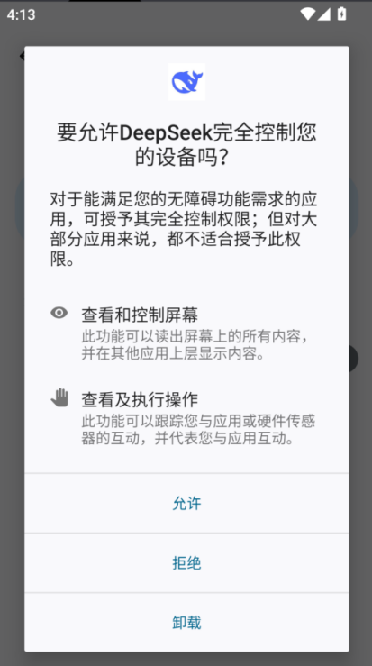 用戶一旦點(diǎn)擊運(yùn)行仿冒APP,該APP會(huì)提示用戶“需要應(yīng)用程序更新”,并誘導(dǎo)用戶點(diǎn)擊“更新”按鈕。用戶點(diǎn)擊后,會(huì)提示安裝所謂的“新版”DeepSeek應(yīng)用程序,實(shí)際上是包含惡意代碼的子安裝包,并會(huì)誘導(dǎo)用戶授予其后臺(tái)運(yùn)行和使用無障礙服務(wù)的權(quán)限,如圖3至圖6所示。