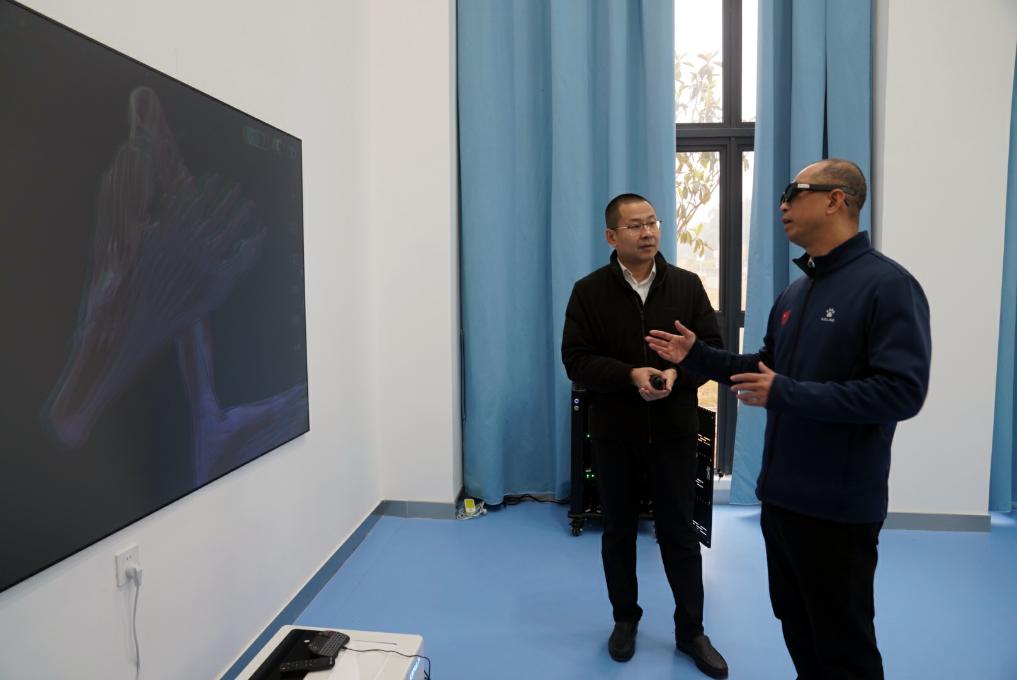 2月17日,在廣西體育高等專(zhuān)科學(xué)校,韋軍與運(yùn)動(dòng)健康學(xué)院的老師交流,了解3D模擬運(yùn)動(dòng)解剖模型如何助力教學(xué)。新華社記者 陳露緣 攝