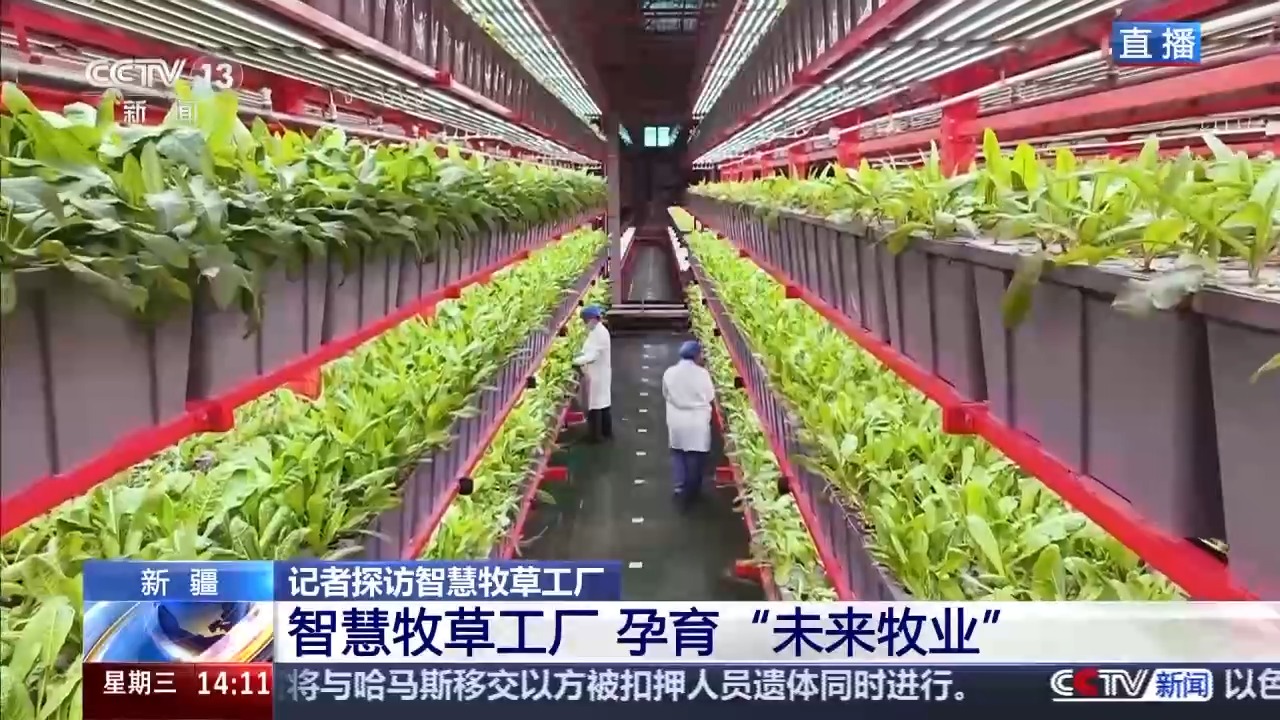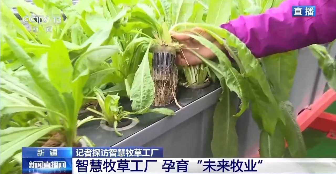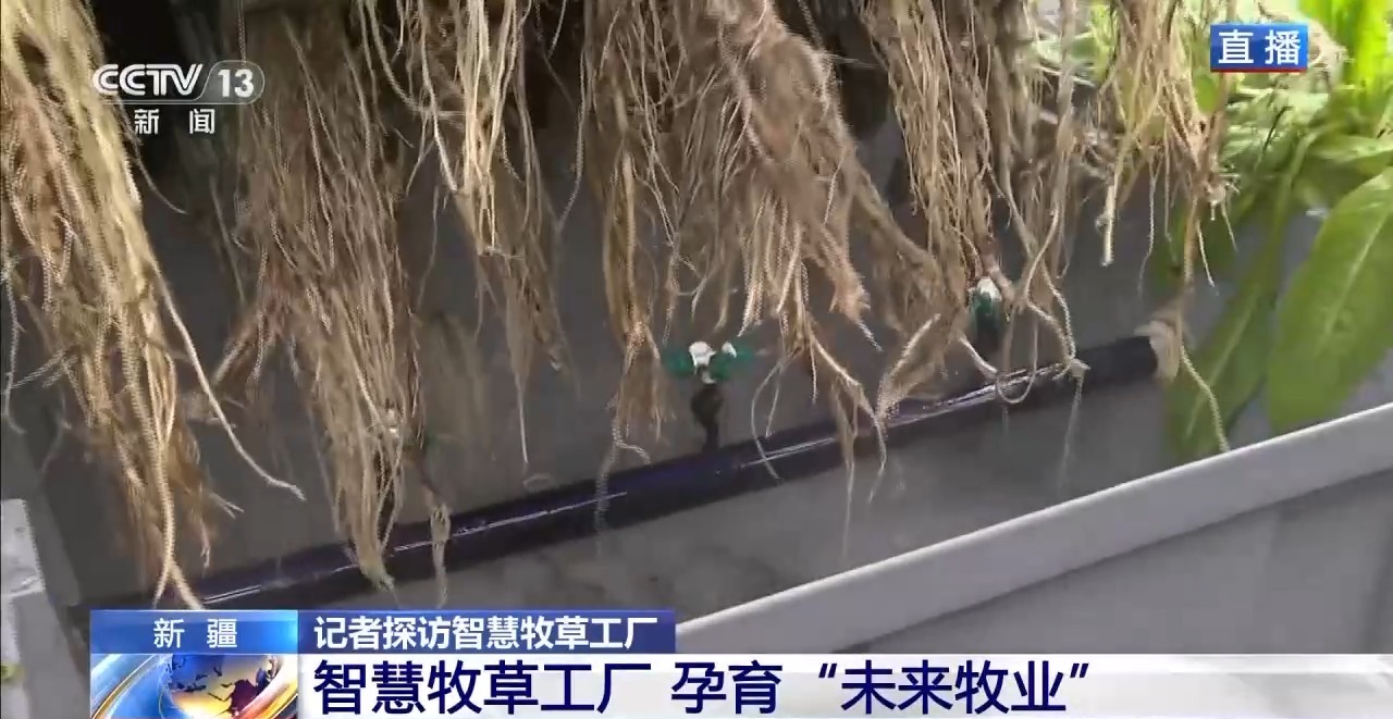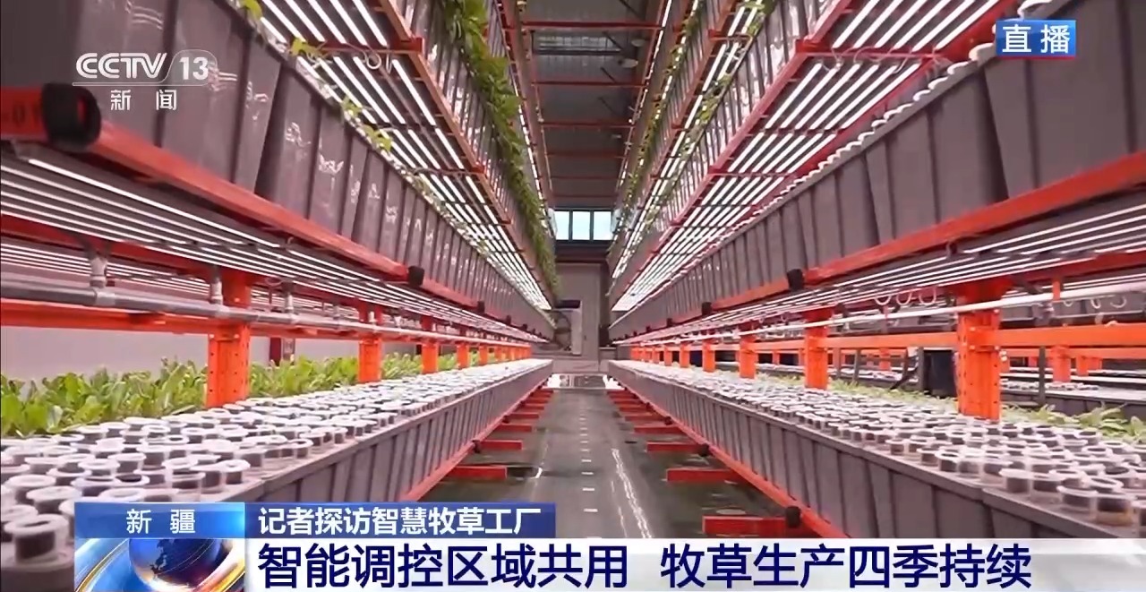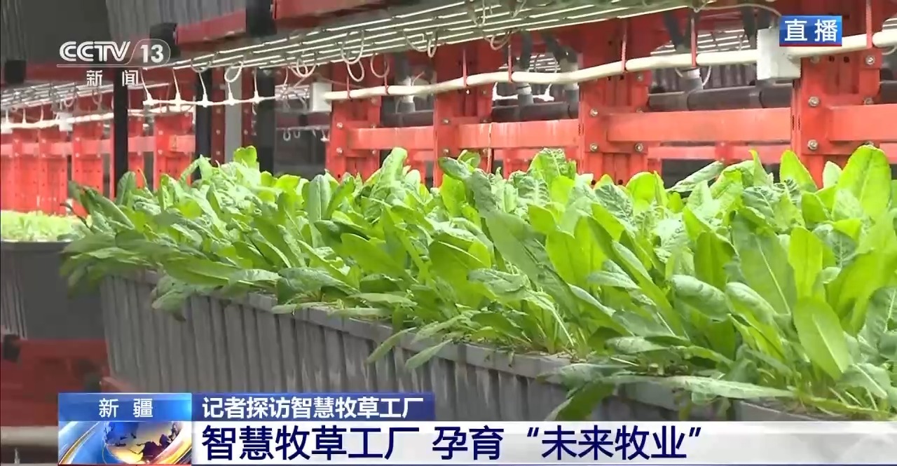 總臺(tái)記者 崔寧:說(shuō)到牧草,大家會(huì)想到一望無(wú)際的大草原,會(huì)想到風(fēng)吹草低見(jiàn)牛羊的千里沃野,但我現(xiàn)在所在的新疆圖木舒克市智慧牧草工廠里看到的是另外一番景象,廠房里沒(méi)有土壤,沒(méi)有四季輪回,牧草卻在這里生長(zhǎng)得郁郁蔥蔥,而且看起來(lái)它的葉片也非常壯實(shí)。