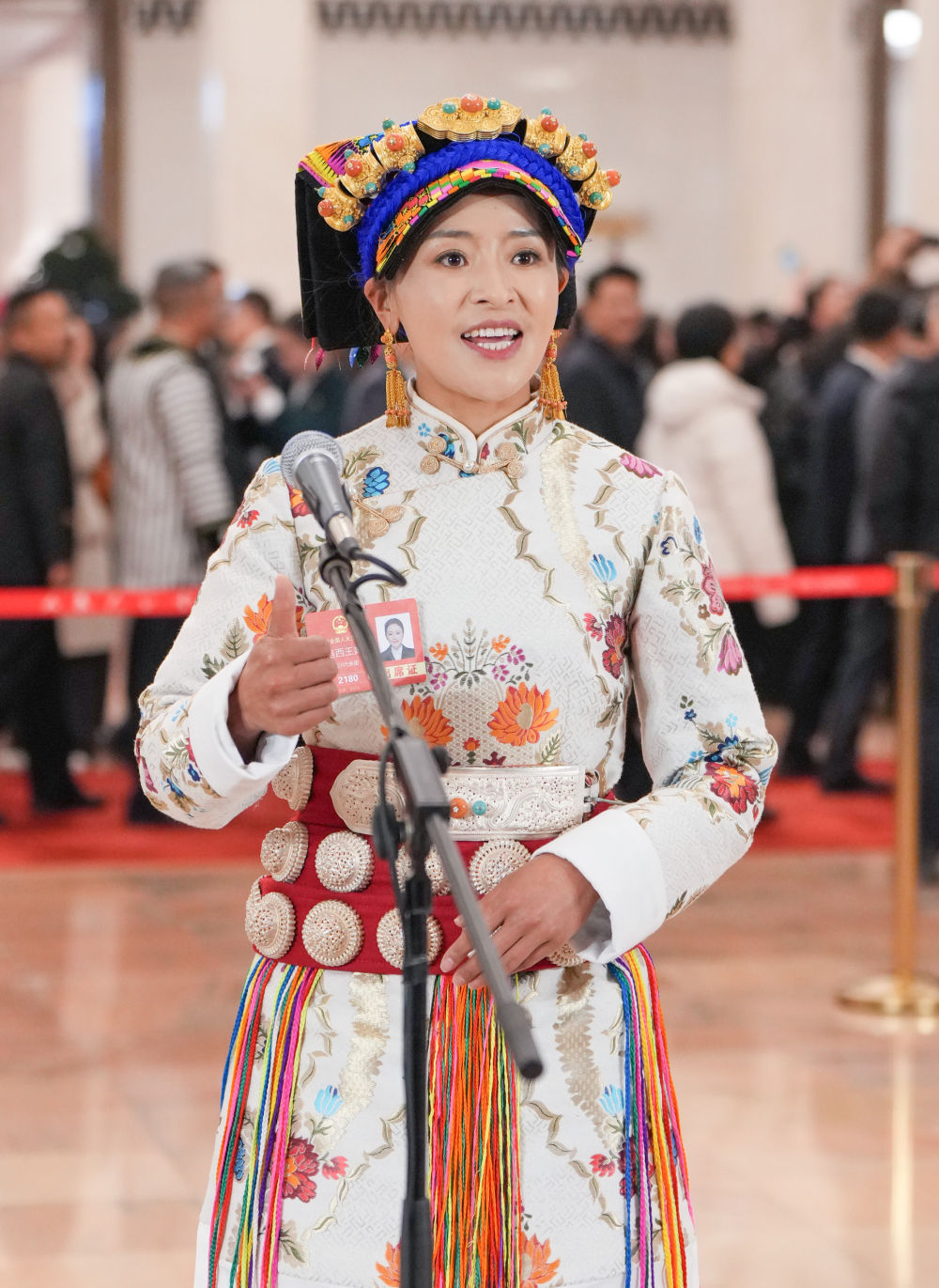 3月5日,第十四屆全國人民代表大會(huì)第三次會(huì)議首場(chǎng)“代表通道”集中采訪活動(dòng)在北京人民大會(huì)堂舉行。這是全國人大代表格西王姆接受媒體采訪。新華社記者 劉大偉 攝