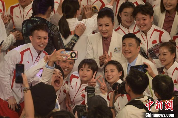 2024年8月30日,訪港的中國內(nèi)地奧運(yùn)健兒出席奧運(yùn)健兒大匯演。圖為香港藝人與奧運(yùn)健兒自拍。 中新社記者 陳永諾 攝