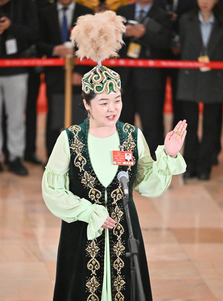 3月11日,第十四屆全國人民代表大會第三次會議第三場“代表通道”集中采訪活動在北京人民大會堂舉行。這是全國人大代表卓婭·巴合提接受媒體采訪。新華社記者 胥冰潔 攝