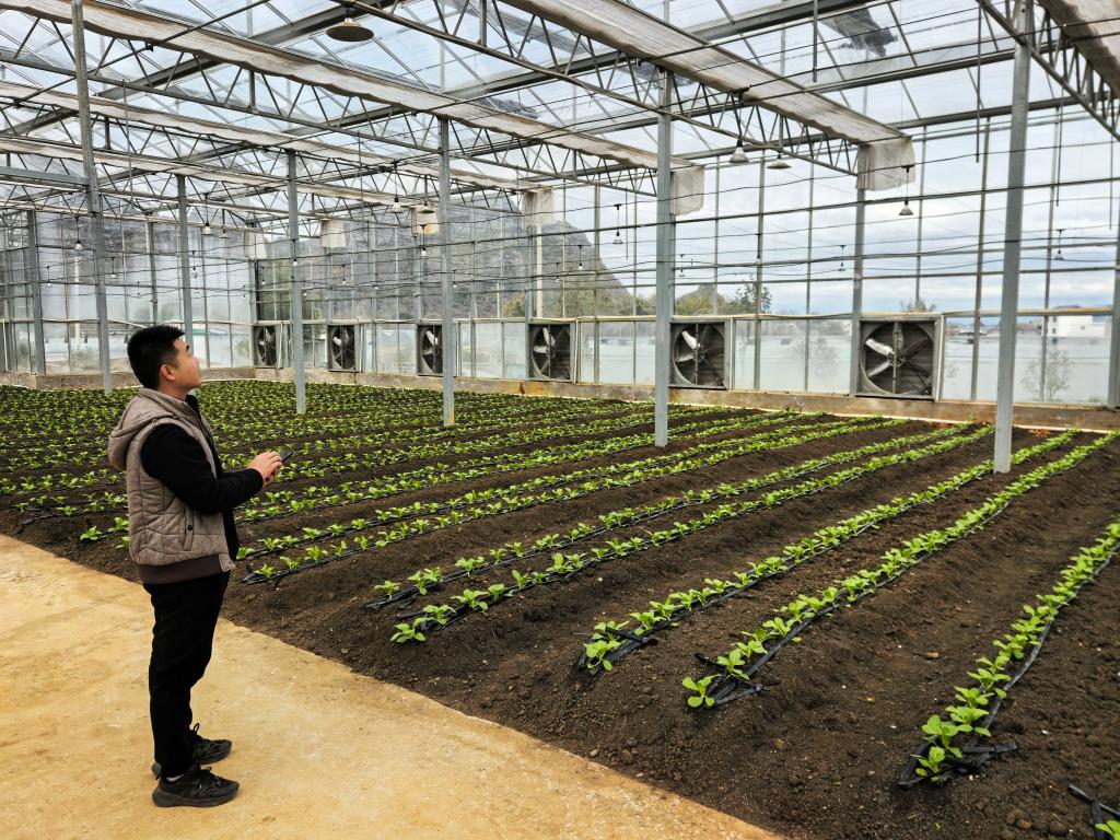 廣西賀州市平桂區(qū)國家現(xiàn)代農業(yè)產業(yè)園品種篩選適應棚內,技術人員陳愈璋利用手機操控大棚農業(yè)設施。新華社記者王楚然 攝