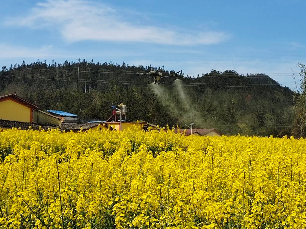 眼下,西部多地油菜進入盛花期,做好田間管理尤為重要。在云南省馬關縣夾寒箐鎮(zhèn)上布高村,縣農業(yè)農村和科學技術局高級農藝師李明兵和同事正操作著植保無人機,沿著設定路線進行飛防作業(yè)。無人機噴灑出霧狀農藥,為1500余畝金色的油菜花海布下一道科技感十足的“防護簾”。
