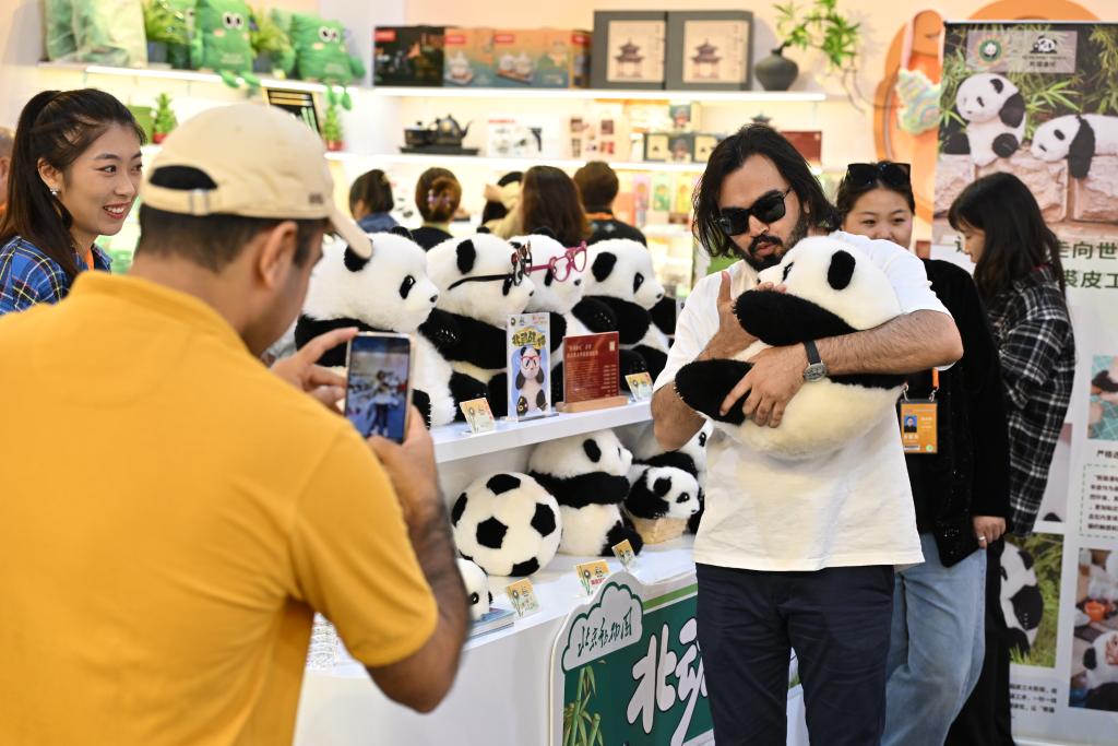 2024年9月16日,參觀者在2024年服貿(mào)會首鋼園區(qū)文旅服務(wù)專題展區(qū)抱著北京動物園推出的大熊貓文創(chuàng)玩偶合影。新華社記者 李鑫 攝